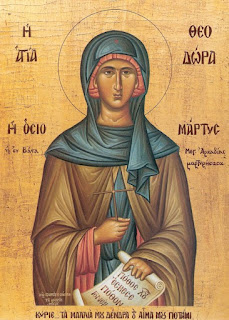 Ἀσκήσει ἐλάμπρυνας, τὴν Ἱεράν σου στολήν, καὶ δῶρον προσήνεξαι, τῷ σαρκωθέντι Θεῷ, Θεοδώρα θεόπνευστε· χάριν δὲ ἰαμάτων, πρὸς αὐτοῦ εἰληφυῖα, νόσων ἀποδιώκεις, τὴν ἀχλὺν μακαρία, πρεσβεύουσα τοῦ σωθῆναι, ἡμᾶς τοὺς εὐφημοῦντάς σε.
